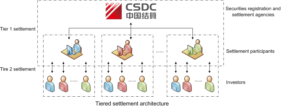 In practice, CSDC conducts securities clearing in line with the tiered clearing principle, as shown in the following figure. The tiered clearing principle means that CSDC does not directly participate in securities clearing services for ordinary investors. Instead, it is responsible for collective clearing and settlement with clearing participants (such as securities companies, custodian banks and other institutions) and completes tier 1 clearing and settlement of securities and capital. The clearing participants are responsible for clearing and settlement with their clients, and they complete tier 2 clearing and settlement of securities and capital. They entrust CSDC with the transfer of securities.