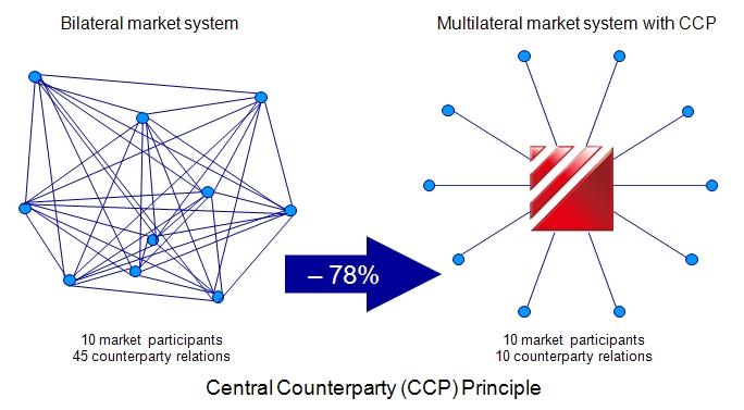 (II) Central Counterparty (CCP) Principle. In this clearing process, CSDC gets involved in the securities transaction and becomes the settlement counterparty of all the buyers and sellers to ensure the successful completion of the settlement. The CCP principle helps simplify the clearing process and improve efficiency. At the same time, CSDC can manage collectively the credit risks of counterparties in the market according to clearing and settlement business rules, which is conducive to controlling and reducing the overall market risks. As shown in the following figure, when there are 10 participants in the market, there are altogether 45 counterparty relations. If CSDC acts as the CCP, only 10 counterparty relations are needed, and the number of counterparty relations can be downsized by 78%.